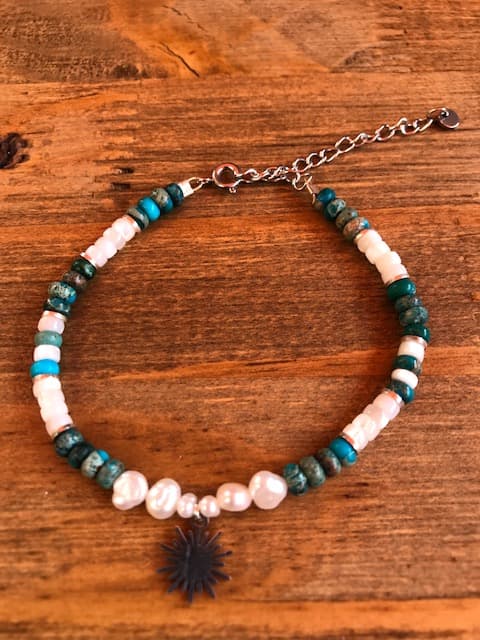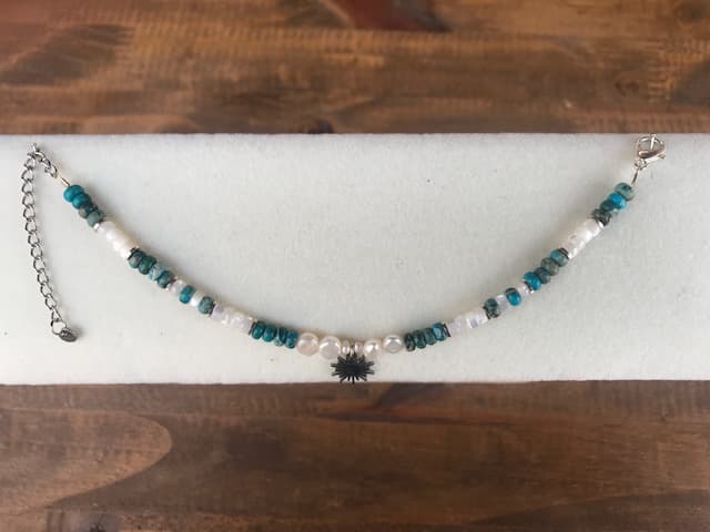 Chaîne argentée acier inoxydable. Perles d’eau douce / Nacre blanche Heishi et pierres gemmes bleues Heishi . Breloque Soleil: acier inoxydable.