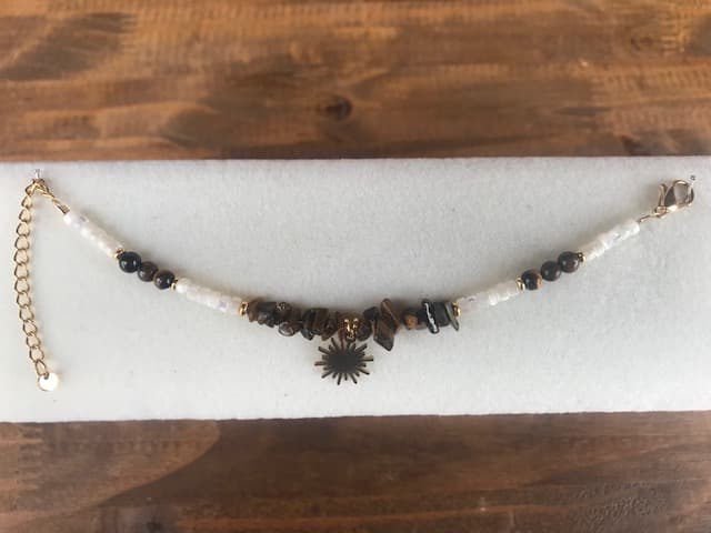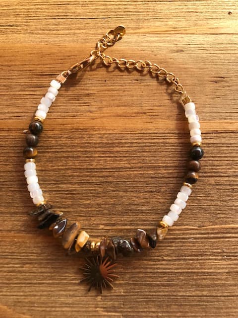 Chaîne dorée acier inoxydable. Pierres nacre Heishi blanches et pierre gemme couleur oeil de tigre et chips couleur oeil de tigre. Breloque Soleil: acier doré inoxydable.