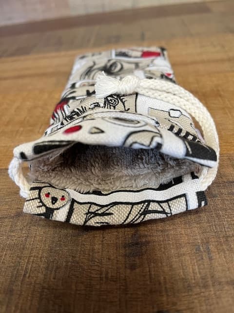 Intérieur éponge noisette. Fermeture par liens coulissants. Les motifs peuvent être placés différemment en fonction de la coupe du tissu