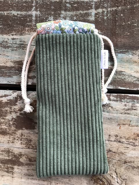 Etui à lunettes en velours côtelé vert fôret et intérieur éponge écrue (pattes de coulisse tissu fleuri et liens cordon) . Dimension en cm +/- : 8 x 19