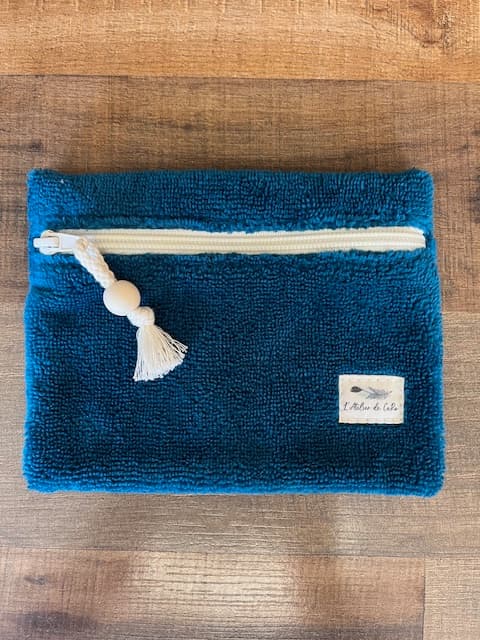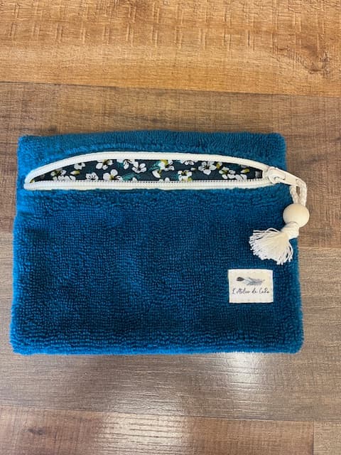 Mini Pochette plate éponge Bambou bleu canard. Intérieur tissu coton fleuri. Fermeture éclair