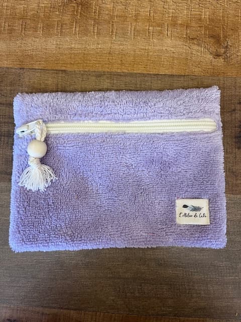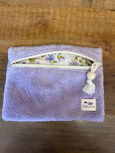 Mini Pochette plate éponge Bambou mauve. Intérieur tissu coton fleuri. Fermeture éclair couleur selon fabrication (beige ou violette)