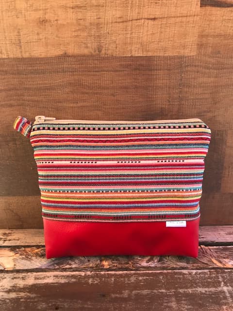 Pochette bi-matière Simili cuir rouge et tissu tissé à rayures  . Dimension +/- : 23 x 16 cm (LxH)