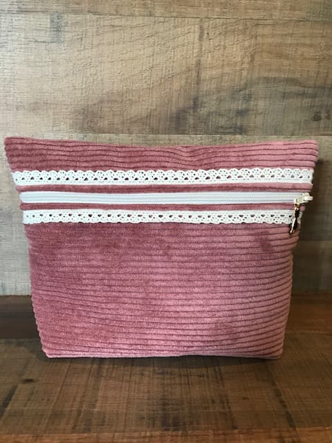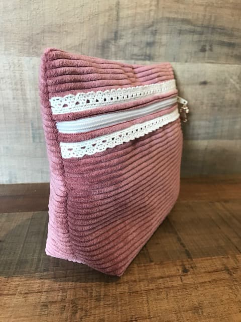 Pochette velours côtelé vieux rose. Intérieur tissu coton fleuri.