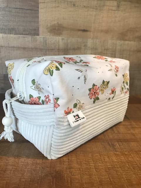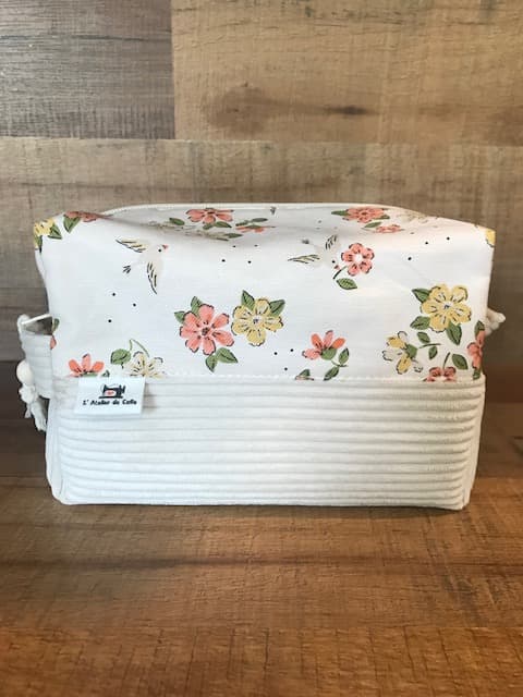 Trousse de toilette bi matière . Partie inférieure: velours côtelé écru – Partie supérieure et doublure : Tissu coton .Dimension en cm+/- : LxPxH : 18x10x12