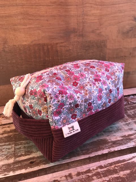 Trousse de toilette bi matière . Partie inférieure: velours côtelé prune – Partie supérieure et doublure : Tissu coton enduit .Dimension en cm+/- : LxPxH : 18x10x12